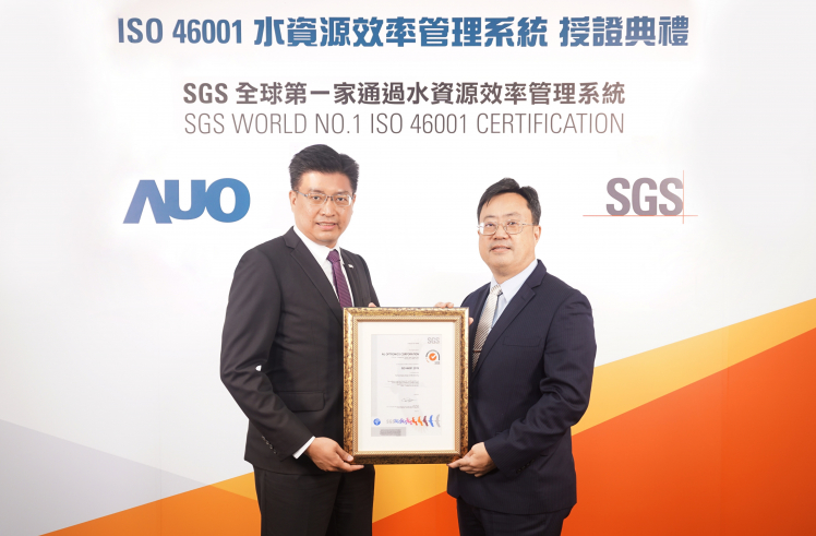友達取得全臺第一張 ISO 46001 水資源效率管理系統(tǒng)驗證,透過嚴謹且精進的管理系統(tǒng),具體展現(xiàn)永續(xù)承諾 (左:友達製造營運群副總經(jīng)理林挺立,右:SGS 臺灣檢驗科技總裁邱志宏)